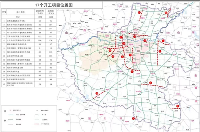 近日,河南省17個交通重點項目分別在鄭州、開封、洛陽等16個省轄市同步宣布開工建設(shè)。開工的17個項目包括16個、共1050公里的高速公路,總投資達(dá)1640億元。至此,河南省高速公路建設(shè)項目達(dá)到53個,3390公里,總投資高達(dá)4556億元。