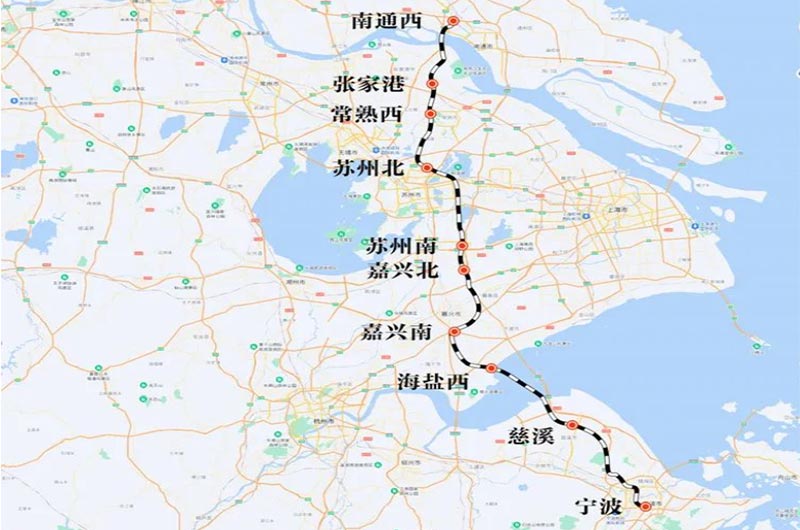 通蘇嘉甬鐵路位于江蘇省和浙江省境內,為南北向鐵路,線路北起南通市南通西站,與鹽通鐵路正線貫通,向南跨過長江后,經(jīng)過蘇州市、嘉興市后跨過杭州灣進入寧波市。